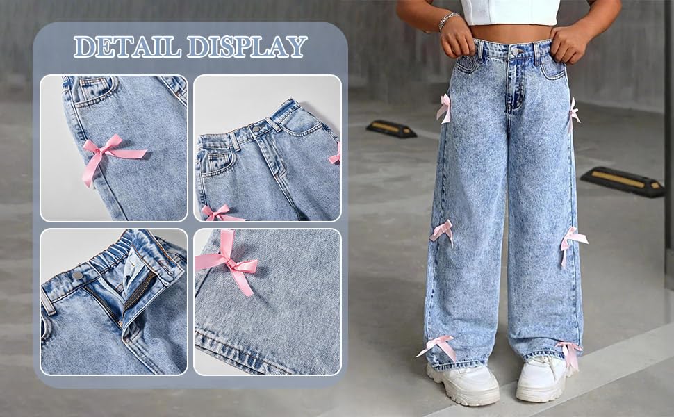 Bow Jeans for Girls,Wide Leg Kids Baggy Flare Denim Pants Y2k High Waist Denim Pants 7