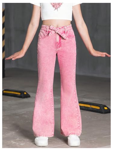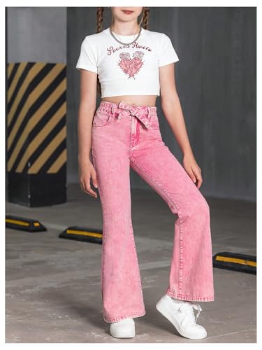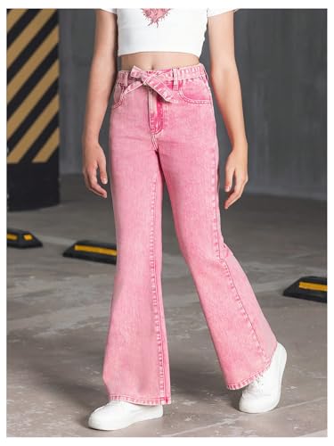 WDIRARA Girl's High Waist Flare Leg Jeans Washed Belted Y2k Denim Pants with Pockets 6