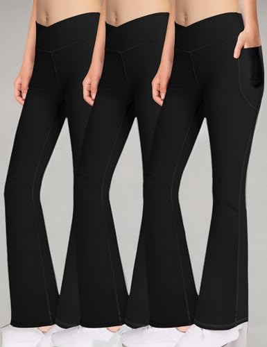 Bootcut Yoga Pants Flare Leggings for Girls - Crossover High Waisted Dance Pants with Pockets for Teens Black/Black/Black 3