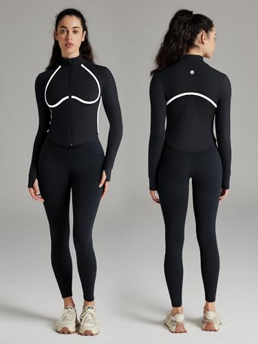 Women Workout Jacket Cropped Contrast Seam Zip Up Athletic Jacket Yoga Sportswear with Thumb Holes 1