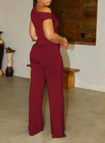 More information about HBQ Women's Summer 2 Piece Outfits Casual Tracksuit One Shoulder Asymmetrical Short Sleeve Wide Leg Long Pant Lounge Sets
