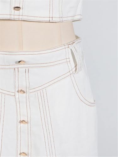 Women Spliced Button Two Piece Set Square Collar Sleeveless Short Tops High Waist A Line Long Skirts Suit 5