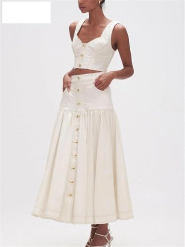 HOT ! Women Spliced Button Two Piece Set Square Collar Sleeveless Short Tops High Waist A Line Long Skirts Suit