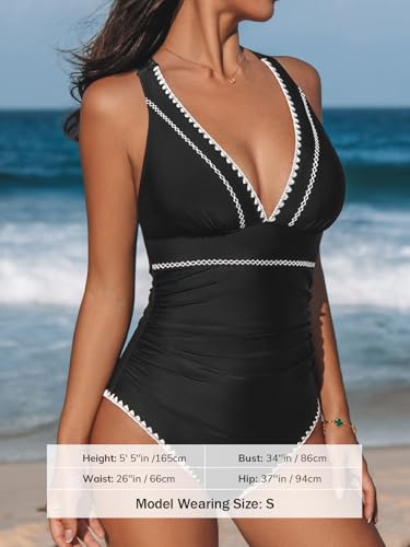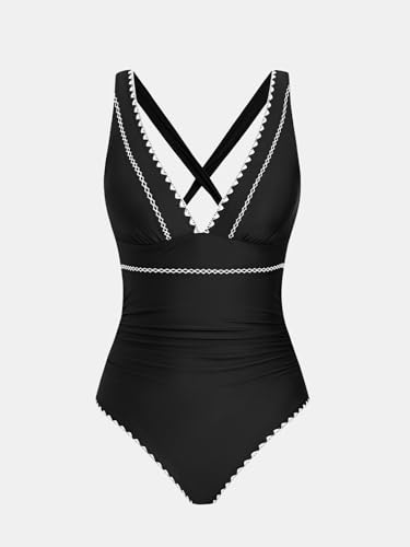 • Design: Embrace beach elegance with this one piece swimsuit, featuring a deep V neckline and waistline adorned with delicate shell stitch detailing. Ruched elements at the midsection offer flattering tummy control, while the crisscross self tie straps ensures a secure and personalized fit.