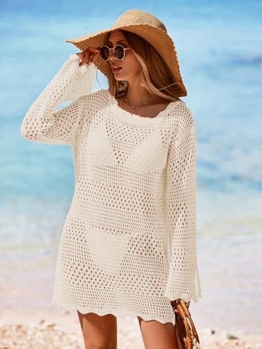 More information about Womens Crochet Knit Swimsuit Coverup Mini Dress Summer 2025 Boat Neck Wavy Trim Beach Bathing Suit Cover Up