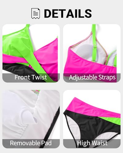 • Plus Size Two Piece Swimsuit: Stylish color block patterns and a chic twist-front create a modern look. Full coverage bottoms balance the trendy v neck top.