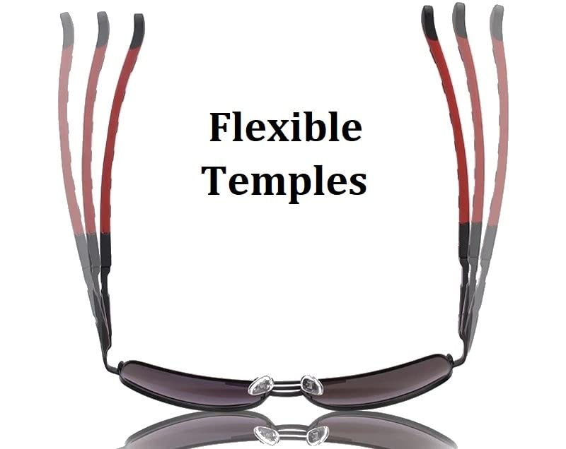 • FLEXIBLE ARMS EXTEND OUTWARD TO FIT LARGER HEADS: with the upgraded flexible arms and spring-adjustable hinges, the sunglasses sit comfortably, regardless of your head size, and don't put unnecessary pressure on your temples. This also ensures that you will worry less about breaking the sunglasses.