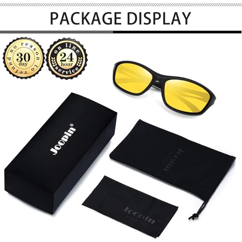 • High Definition Night Glasses Relive Eye Strain: Joopin yellow driving glasses can protect your eyes from harsh environmental elements, reduce glare from oncoming car headlights or sharp reflections. Night time driving glasses can improve contrast and visual clarity, provide more soft yet clear vision when driving at night or cloudy, foggy, rainy, snowing day. Joopin precise-cut provide a safe guard for the no glare night view glasses, enjoy easy driving with Joopin eyewear