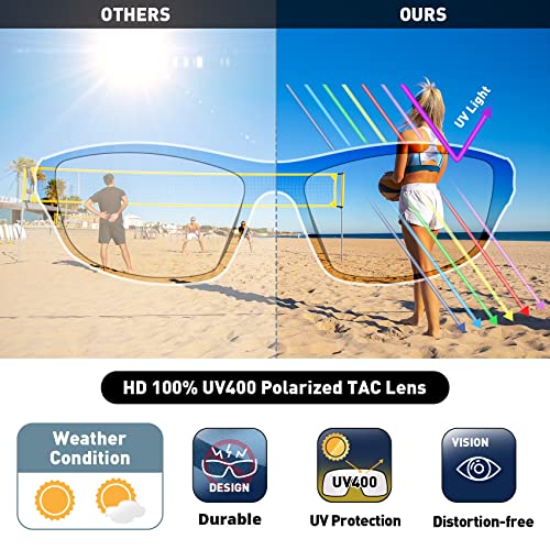 • ⭐KEY FEATURES - Polarized lenses reduce glare - Impact resistant TAC lenses protect your eyes from flying objects - Block 100% of the harmful UVA and UVB rays - Lightweight, durable, and comfortable TR90 frames with spring hinges