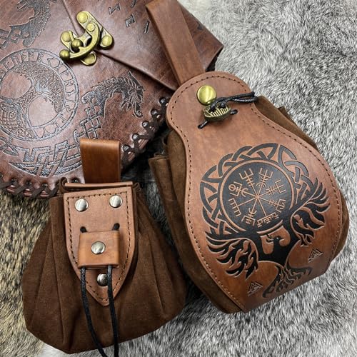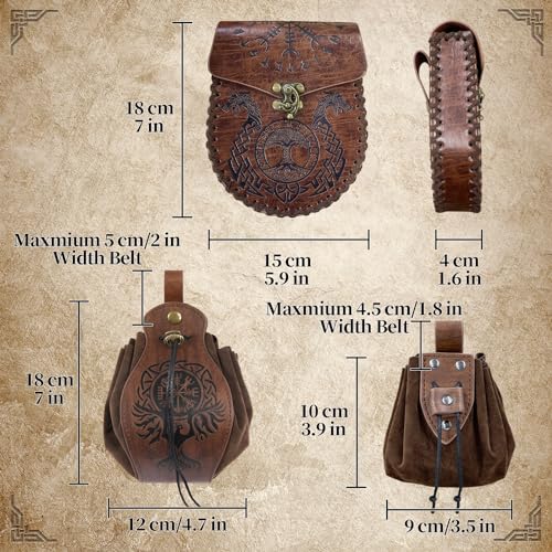 • 【PREMIUM MATERIALS AND CRAFTSMANSHIP】Our drawstring pouches are meticulously crafted from quality leather, ensuring durability and authenticity. Likewise, our Viking waist bags feature premium materials and intricate metalwork, reflecting the craftsmanship of Norse artisans.