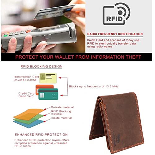 • GENUINE LEATHER: Coffee Brown Distressed Hunter Cowhide Leather Wallet with a unique vintage look and feel. This distressed leather wallet will go through each and everyday with you building it's own unique patina as it ages. Each wallet will have it's own story to tell as it ventures through life alongside you.