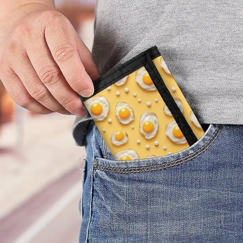 • Design: Featuring a versatile trifold design, this men's wallet includes a front zipper compartment for quick access to essentials. Inside, there are spaces dedicated for ID cards, cards, and changes. The inclusion of a keychain allows you to carry your keys effortlessly, making it a Pepper Fried Egg Print simple wallet for men that's all about practicality