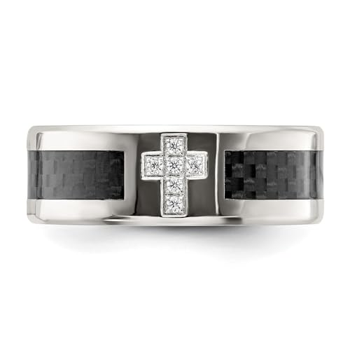 Stainless Steel Polished with Black Carbon Fiber Inlay Cubic Zirconia Cross 8 mm Band Size 7 to 13 3