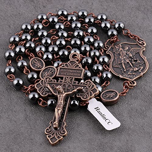 • The St.Michael Catholic rosary necklace Hail Mary beads size is 6mm hematite beads, Our Father beads are 8x10mm Saint Michael Zinc Alloy Antique copper metal Beads, it is make you can pray with your eyes closed and know you have reached the end of a decade and can meditate on the next Mystery of the rosary.