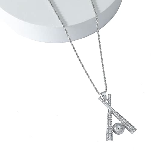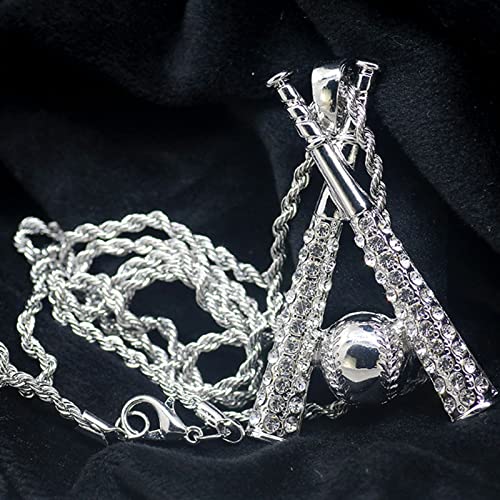 HOT ! Baseball Necklace Hip Hop Baseball Pendant Baseball Bat Cross Stainless Steel Pendant Necklace Sports Jewelry Sports Necklace Rhinestone Baseball Necklace for Men and Women (Silver)
