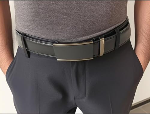 • PREMIUM DESIGN: Sleek black faux leather belt with automatic ratchet buckle system for precise adjustments and modern business style