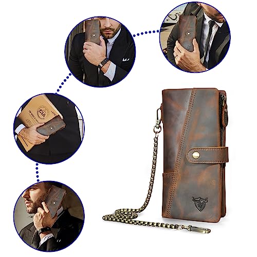 Genuine Crazy Horse Leather Travel Gift Coin Pocket Card Case Long Organizer Chain Rfid Wallet Purse With Snap For Men Male 1803 (1803 Brown) 4