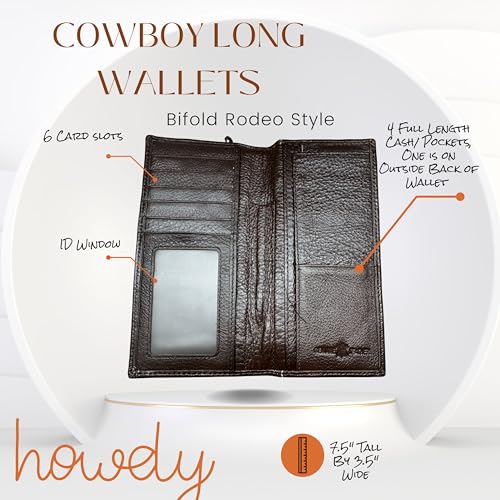 • Rodeo-Style Long Bifold Functionality Spacious interior with multiple card slots, clear ID window, checkbook holder, and bill compartments.