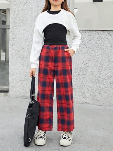 Girl's Plaid Wide Leg Pants Elastic High Waisted Trousers Trendy Sweatpants with Slant Pockets Red 10 Years 4