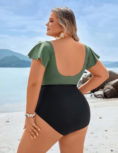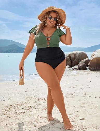 • Feature: Plus size swimsuit for women features deep v neck, front crisscross, ruched details at the waist, ruffle sleeve and backless design, a fashionable and flattering one piece bathing suit.