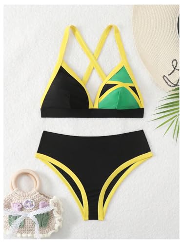 GORGLITTER Women's Triangle Jamaica Swimsuits Color Block High Waisted Bikini High Cut Thong Bathing Suit 6