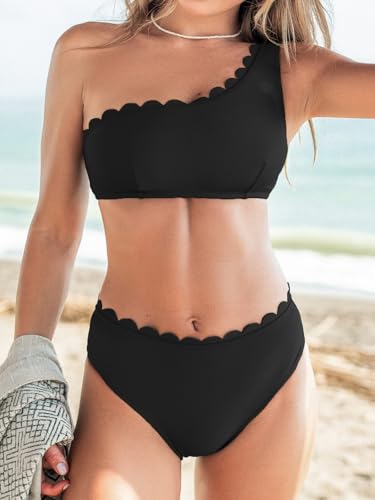 • Design: Make a splash with our one shoulder asymmetrical scalloped neck bikini sets. This delicate two piece swimsuit ensemble features mid rise scalloped bottom and back hook design make you looks flattering.