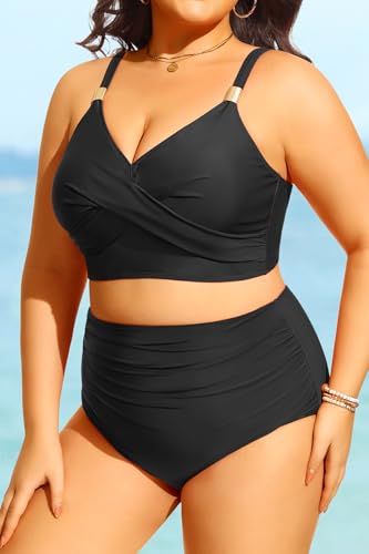 • Plus Size High Waist Bikini: This two-piece bikini set with a ruched design offers flattering tummy control, creating a slimming and feminine look for women and moms.