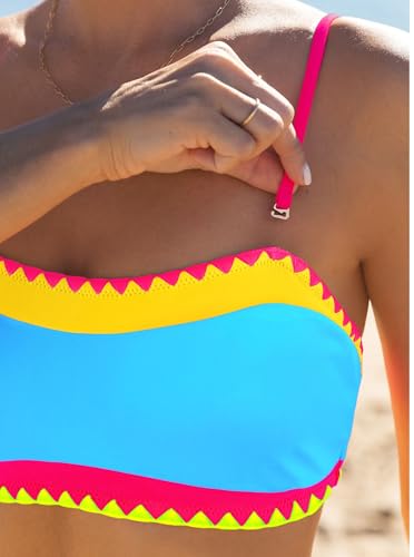 popvil Women's Strapless Bikini Sets Neon Color Block Bandeau Swimsuits Two Piece Bathing Suits for Beach Vacation 2025 5