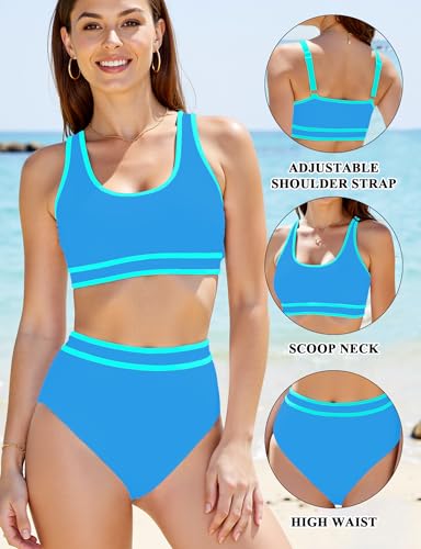 • 【Sporty scoop neck crop top】 This high-waisted swimsuit is designed with a sporty crop top. Adjustable elastic straps allow you to freely adjust the elasticity and length without making you feel constricted. The scoop neckline design makes the whole swimsuit more sporty and shows your youthful vigor better. Removable bust pads provide better support and allow you to move freely. Contrasting color blocking makes the swimsuit more design, show your charming femininity