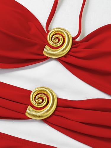• Features: Bandeau one-piece swimsuit features sexy cut-outs in the front, very textured metal conch accessories, a halter strap at the neckline for easy adjustment of tightness, sleeveless, tight fit, high leg swim cover-up skirt