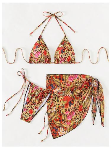 SOLY HUX Women's 3 Piece Swimsuits Print Halter Triangle Tie Side Bikini Bathing Suit with Cover Up Beach Skirt 1