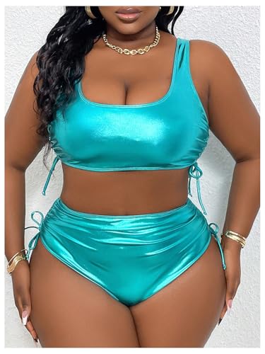 More information about OYOANGLE Women's Plus Size Metallic Scoop Neck Bikini Set Drawstring Ruched Swimsuit Beachwear