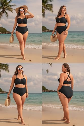 • Plus Size High Waist Bikini: High-waisted bikini bottom with side criss-cross detailing for a slimming effect. Ruching bottoms provide tummy control.