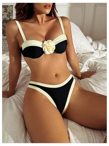 GORGLITTER Women's Two Piece 3D Flower Bikini Sets Contrast Binding High Cut Thong Swimsuits 3