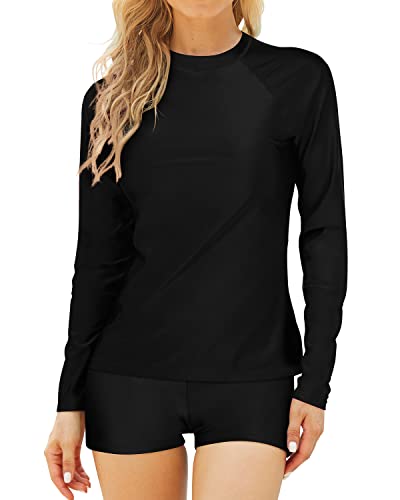 • Long Sleeve Swimming Suits for Women: This two piece crew neck rashguard features pure black color. The swim shirt comes in multiple color combinations, making it suitable for teens, ladies, and girls.