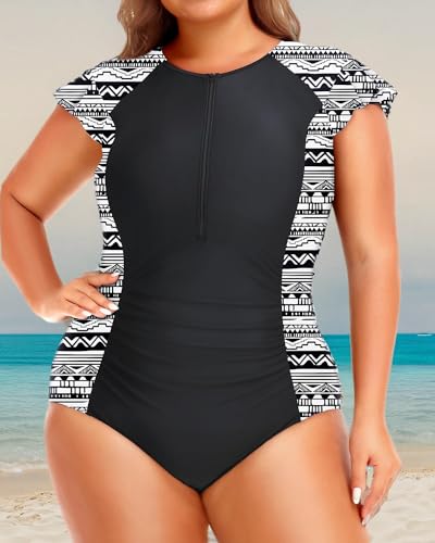 Holipick Plus Size One Piece Swimsuit for Women Tummy Control Cap Sleeves Bathing Suits Zipper Front Rash Guard Swimwear 1