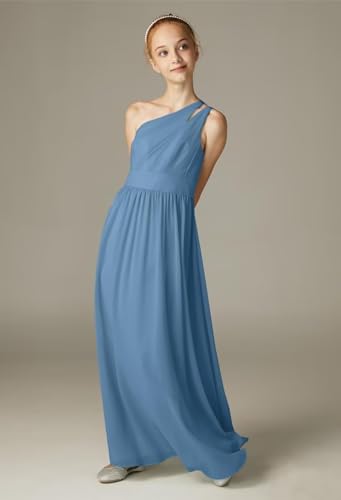 • Features: Ruffles Junior Bridesmaid Dress, Chiffon Flower Girls Dresses for Wedding, One Shoulder Girls Bridesmaid Prom Dress, Ruched Chiffon A-line Flower Girl Dress, A line floor length girls wedding dress, elegant One Shoulder empire waist evening gown. Your little princess will be excited about this gorgeous chiffon dress.