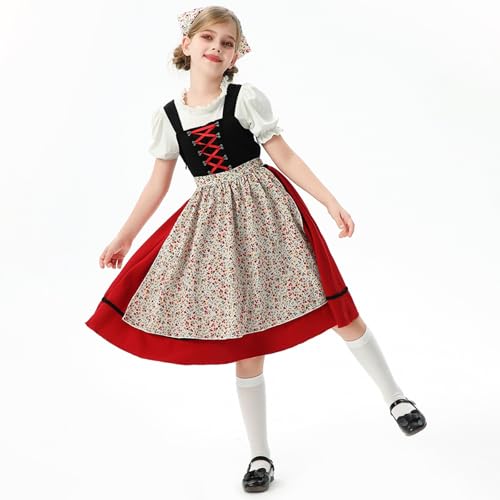 Girls Midi Dirndl Dress Oktoberfest Retro Traditional Pleated Short Sleeve Dresses Flower Graphic Knee Length Skirts 6