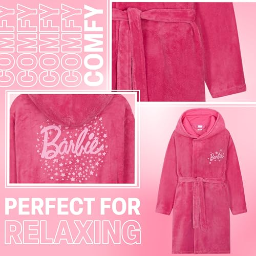 • Barbie Dressing Gown for Girls - Wrap up in cozy Barbie style with this soft fleece dressing gown robe, featuring a hood and tie waist, perfect for keeping warm in classic Barbie comfort