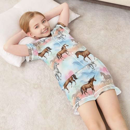 Satin Pajama Sets Short Sleeve Horses Running on Colorful Button Down Silky Nightwear 2 Piece PJS 5-14Y 6