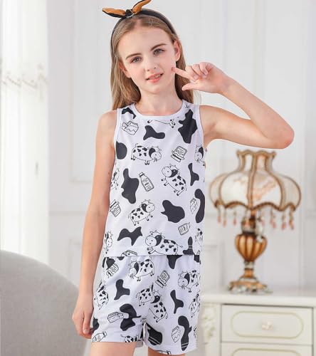 uideazone Girls Pajamas 3 Pieces Set Shirts&Tank Shorts Pjs Sets Cute Sleepwear Size 5-14 6