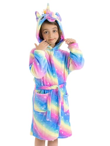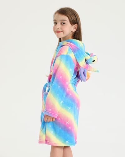 HOT ! Girls Unicorn Fleece Robe, Rainbow Star Leopard Bathrobe for Kids, Coral Fleece Bath Robe With Pockets for Age 3-12