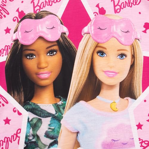 • Enchanting Barbie Nightie Design: This Barbie nightdress features two Barbie dolls in pjs and eye masks ready for a sleepover inside a white star. This nightie girls will love also features hot pink Barbie logos, stars, and silhouettes on a pale pink background