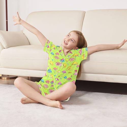 Blue Pink Yellow Mushrooms Pajamas Sets Short Sleeve Silk Stain Pjs Button Down Sleepwear for 5-14Y 5