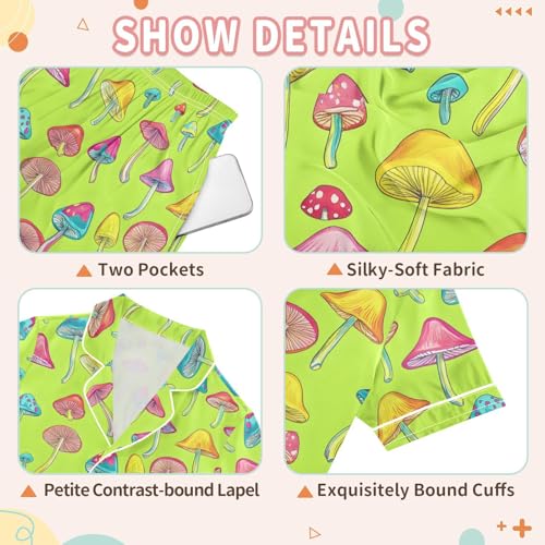 More information about Blue Pink Yellow Mushrooms Pajamas Sets Short Sleeve Silk Stain Pjs Button Down Sleepwear for 5-14Y