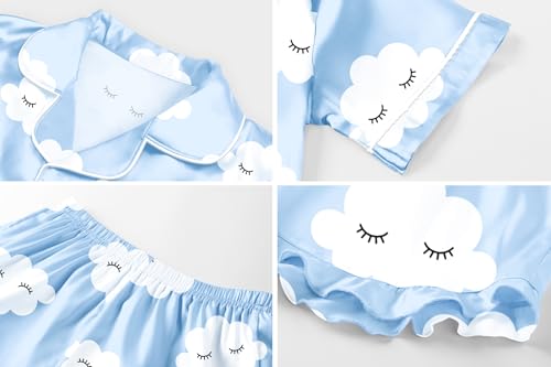 QZH.DUAO Girls Satin Pajamas Set Button Down Silk 2 Piece Pj Sets Ruffle Pants Sleepwear, Blue Eyelashes, 7-8 Years 6