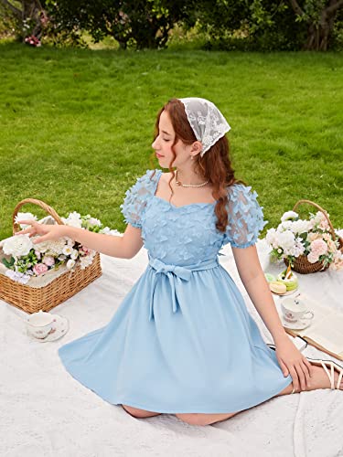 WDIRARA Girl's Butterfly Print Contrast Mesh Short Sleeve Square Neck Belted A Line Dress 6