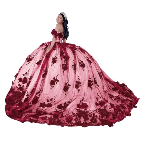 More information about 3D Floral Pearly Quinceanera Dresses with Train Off Shoulder Lace Appliques Sweet 16 Dresses Puffy Tulle Ball Gowns