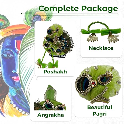 • Complete Dress Set: The outfit includes one designer dress, mukut (crown), mor pankh (peacock feather), necklace, and accessories. It ensures a complete and divine look for your Krishna Ji idol without the need for additional purchases.