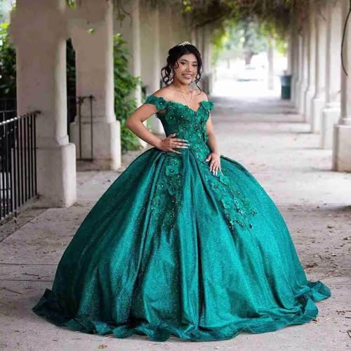 Quinceanera Dresses Glitter Sequined Ball Gown with 3D Lace Flowers Off The Shoulder V Neck Prom Sweet 16 Dresses 3